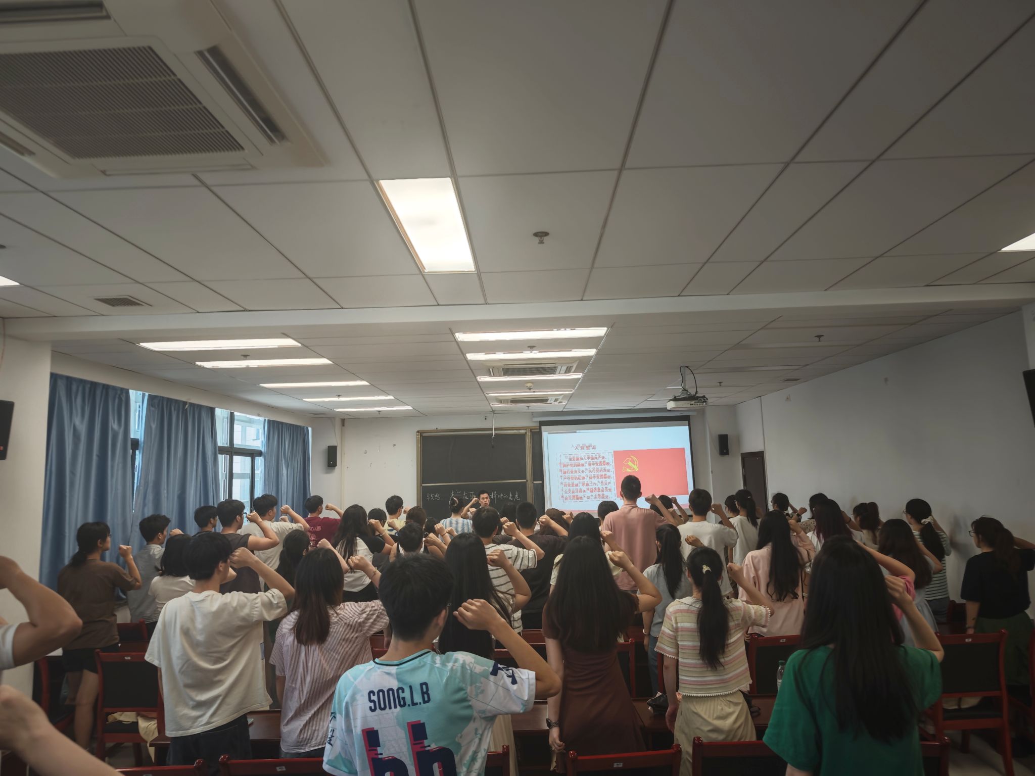 党课结束后,何清达带领全体毕业生党员重温入党誓词,为毕业生党员离校教育画上庄严句号。