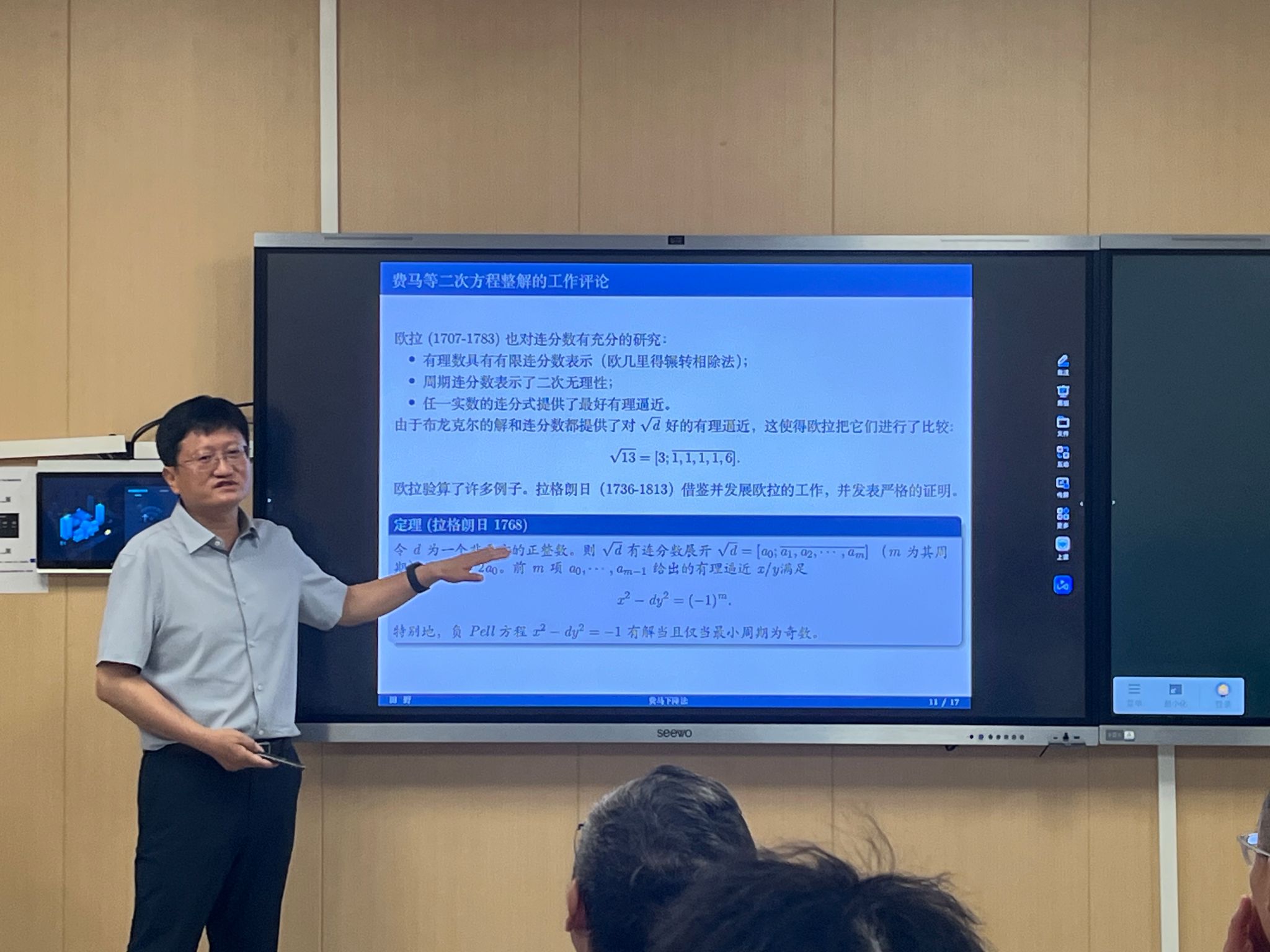 在互动交流环节,田野院士对师生提出的伽罗瓦理论与费马下降法之间的关联、符号系统对数学发展的影响等问题进行了耐心细致的解答。