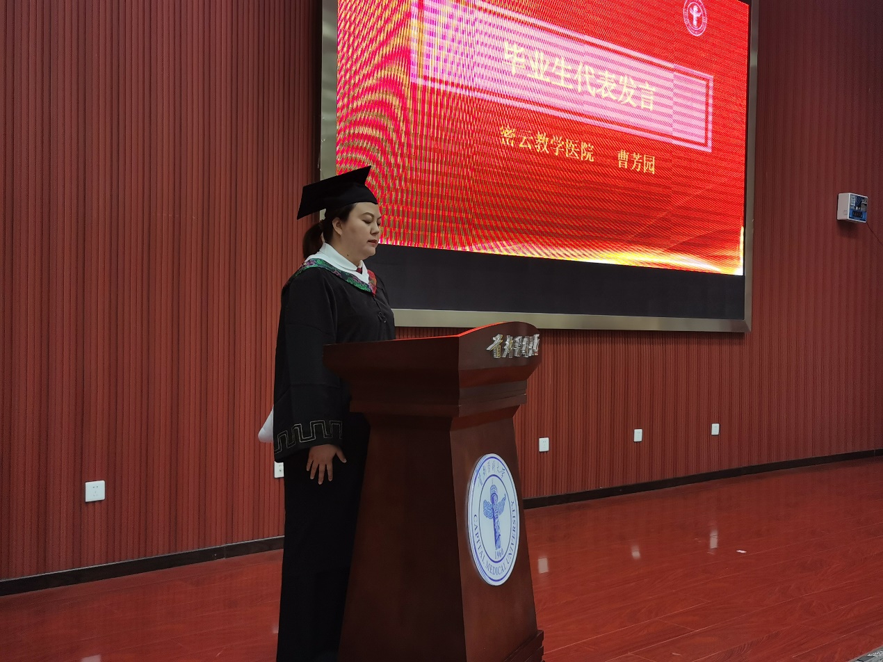 来自密云教学医院的曹芳园同学代表本届毕业生真情实感地说出了自己的学习收获与感想,表示在未来的职业生涯中,将用扎实的专业知识应对复杂的临床挑战。要不断学习、更新知识储备,跟上医学进步的脚步,为患者提供更精准、更有效的医疗服务。