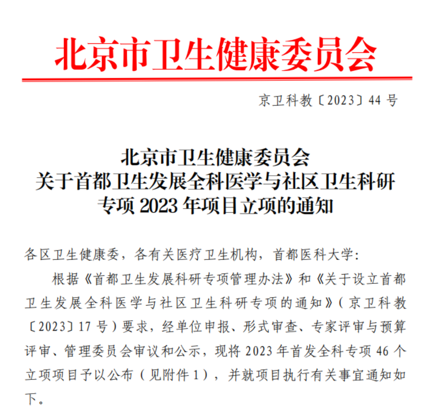 首都卫生发展科研专项首次设立全科医学与社区卫生科研专项并完成2023年立项