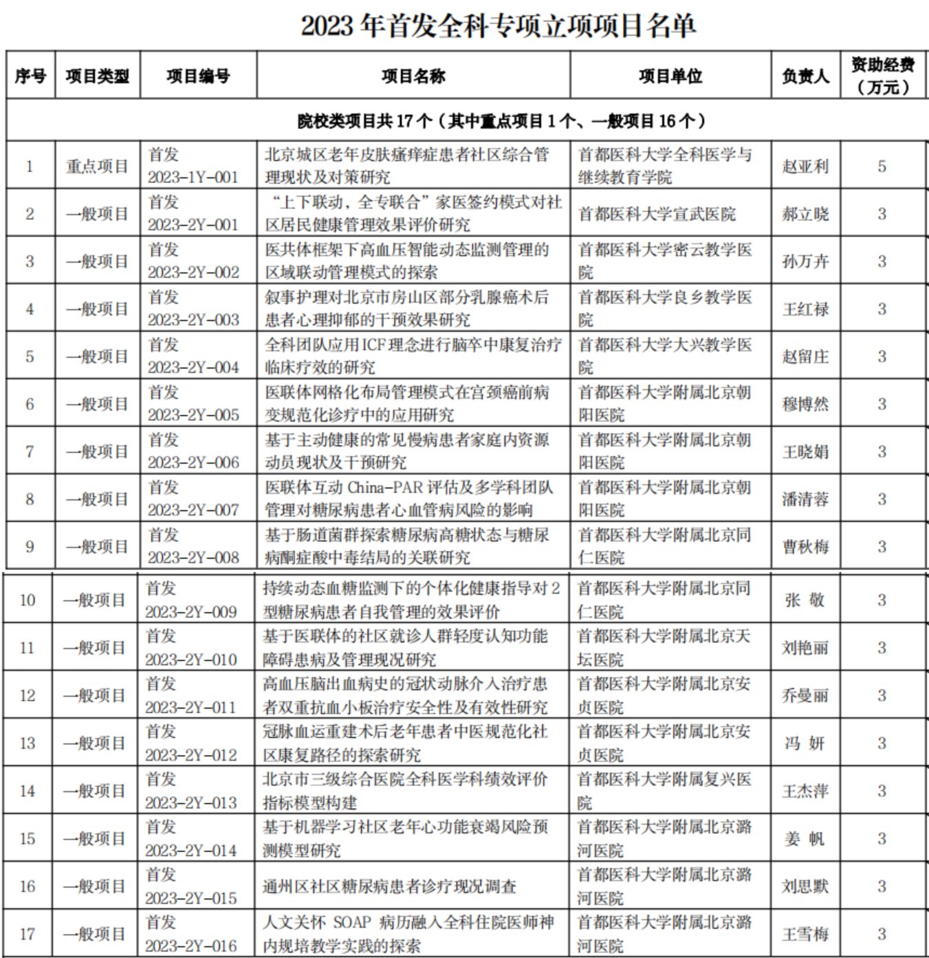 和北京市社区卫生协会分别于2023年6月和7月启动首发全科专项院校类和基层类项目申报工作,经过专家评阅、答辩、公示等环节,2023年12月20日,市卫健委发布了《关于首都卫生发展全科医学与社区卫生科研专项 2023 年项目立项的通知》,最终院校类17个项目立项(其中重点项目1项、一般项目16项),基层类29个项目立项(其中重点项目2项、一般项目8项、普及项目19项)。