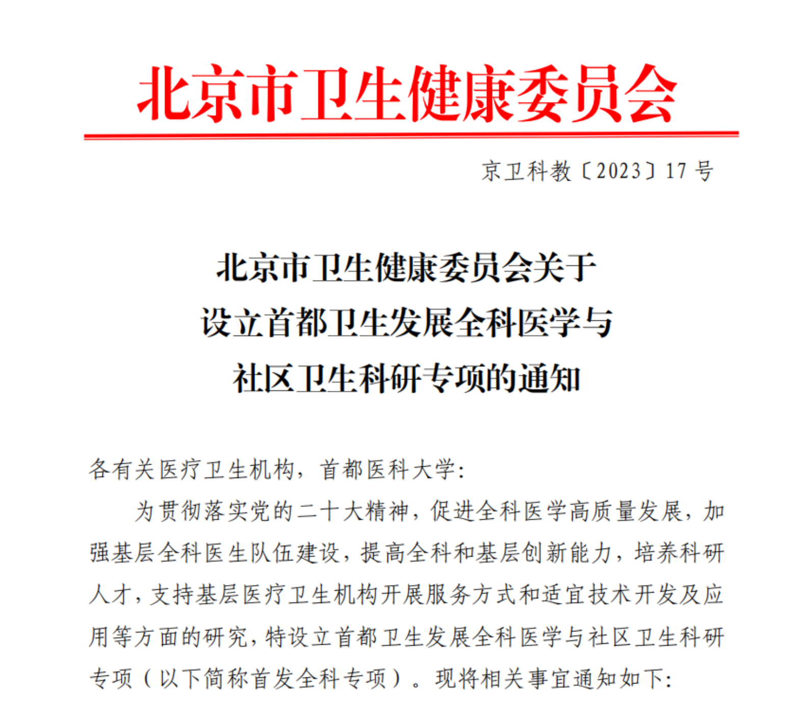 提出在首都卫生发展科研专项下设全科医学与社区卫生科研专项(以下简称首发全科专项)。在学校领导和相关部门以及市卫生健康委的支持下,2023年6月北京市卫健委设立首发全科专项。