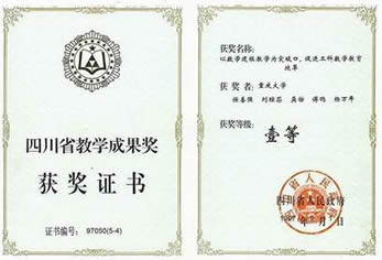 四川省教学成果一等奖“以数学建模教学为突破口,促进工科数学教学改革”,四川省人民政府颁发, 1997.9 ,任善强,刘琼荪,龚劬,傅鹂,何中市;