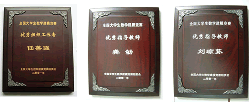 全国大学生数学建模竞赛优秀组织工作者:任善强,优秀指导教师:龚劬,刘琼荪,全国大学生数学建模竞赛组委会颁发, 2001 年;