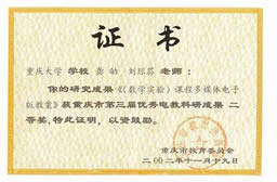 重庆市优秀电教科研成果二等奖:“数学实验课程多媒体电子课件”,重庆市教委颁发, 2002.11 ,龚劬,刘琼荪;